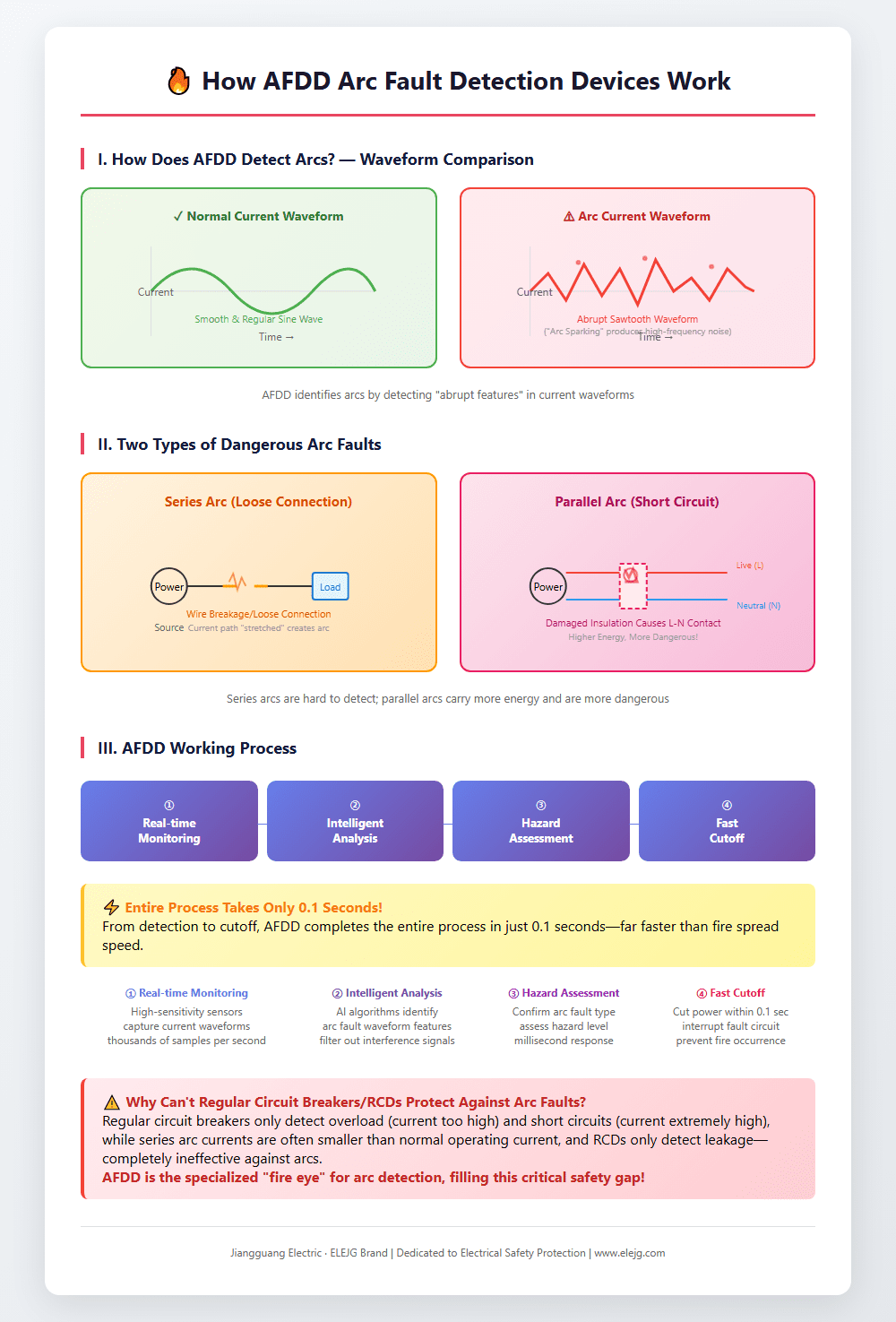 AFDD (Arc Fault Detection Device) acts like a “fire eye” for your electrical circuits. It contains highly sensitive sensors that monitor current waveforms in real-time. Normal current waveforms are smooth and regular, while arc current shows “sawtooth” mutation characteristics. AFDD uses intelligent algorithms to analyze these waveform features, identifying dangerous arcs within milliseconds and cutting off power immediately.
